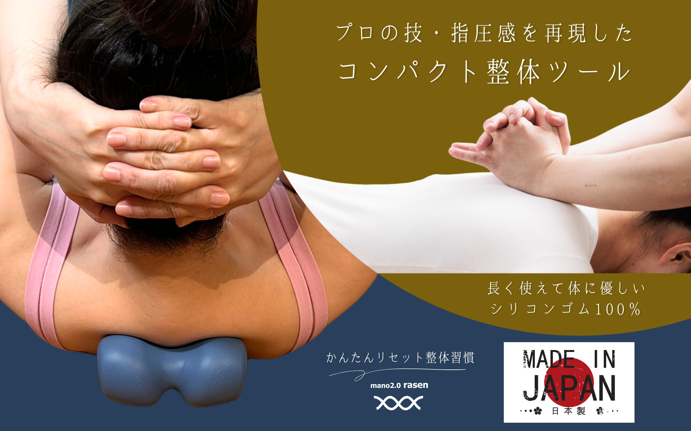 仰向けで首や腰の下に『mano2.0rasen』をセットしたら、刺激したい部位をゆっくり下して徐々に体重をかけます。